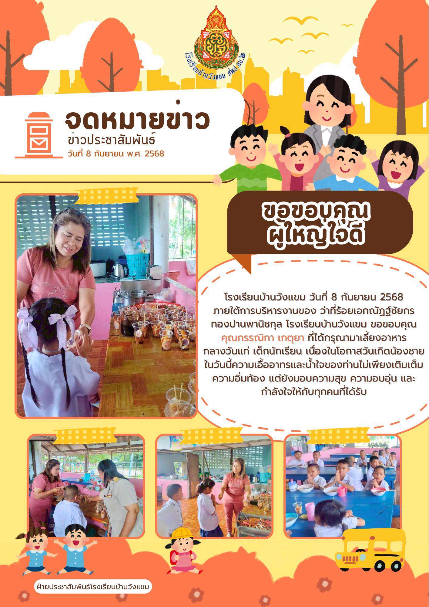 โรงเรียนบ้านวังแขม ขอขอบคุณ คุณกรรณิกา เกตุยา ที่ได้กรุณามาเลี้ยงอาหาร กลางวันแก่ เด็กนักเรียน